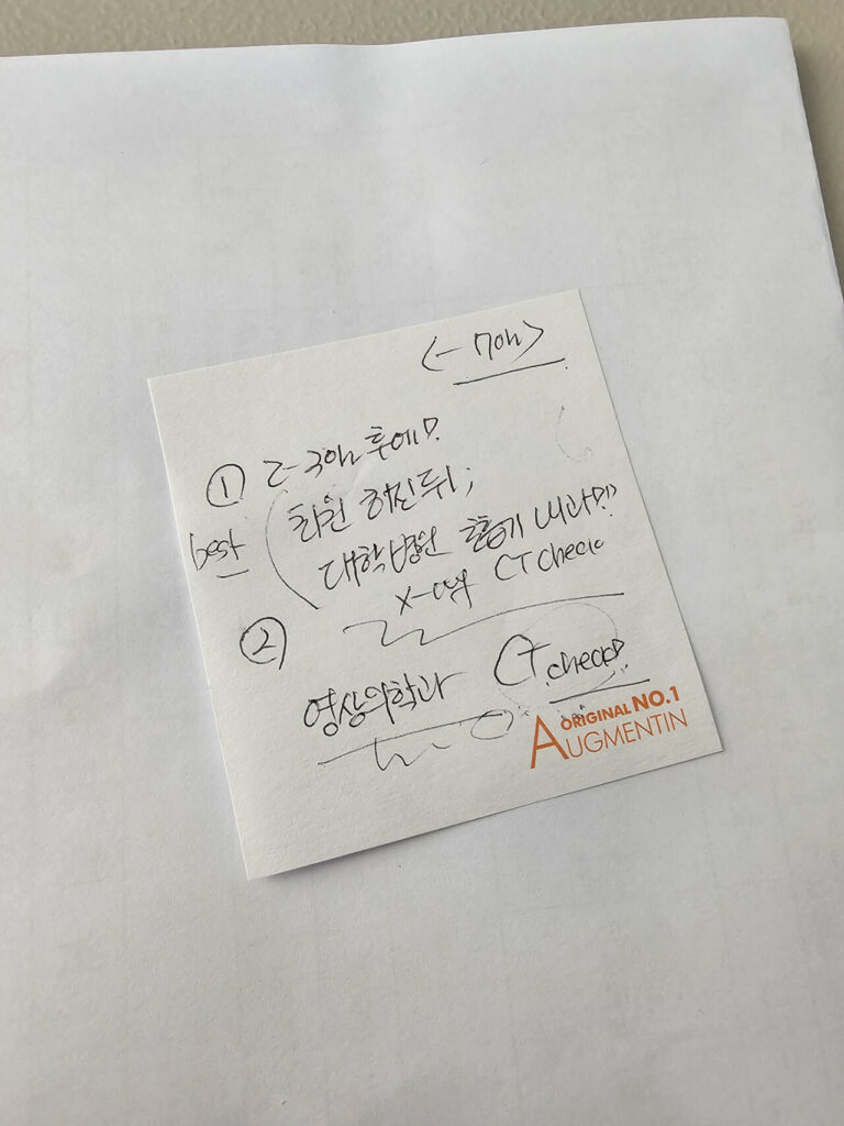 다음 날, 대전에서 큰 병원 여러 군데 전화를 해봤지만 바로 진료를 볼 수 있는 데는 없었고, 자생한방병원과 같은 건물을 쓰는 이비인후과·소아과에서 코로나 검사를 하며 겸사겸사 폐에 있는 이상 소견을 여쭈어보았다.